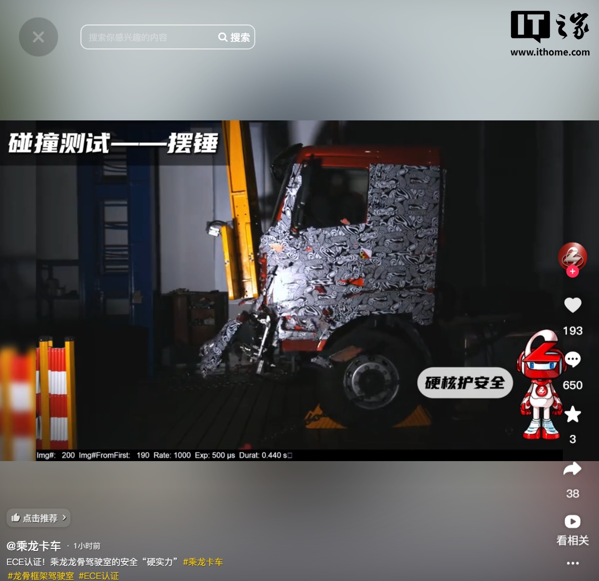 乘龙卡车官方抖音账号当晚发布了一段介绍自家卡车“乘龙龙骨驾驶室”的视频,并称安全“硬实力”。