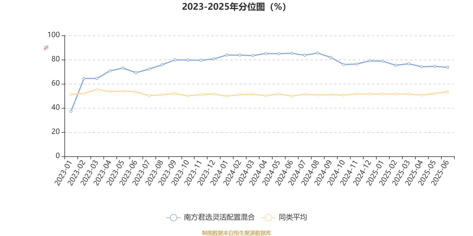 通过所选区间该基金净值增长率分位图,可以观察该基金与同类基金业绩比较情况。图为坐标原点到区间内某时点的净值增长率在同类基金中的分位数。