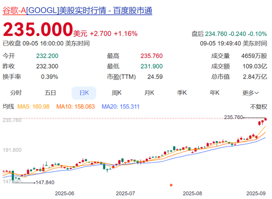 当地时间9月5日,谷歌股价刷新近年新高,报收235美元,总市值2.84万亿美元,续创历史新高。盘后转跌。